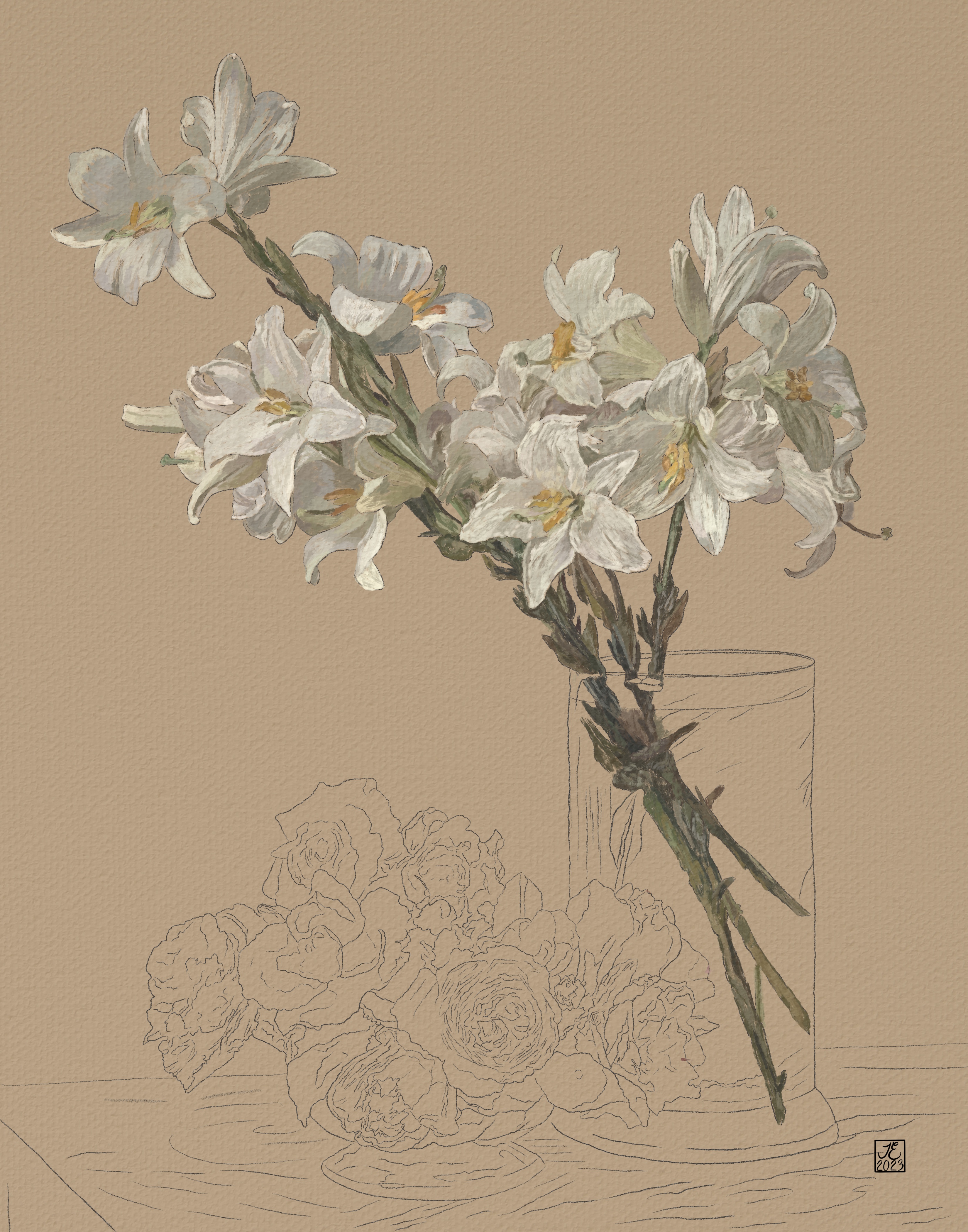 While traditional artists may have the advantage of working with actual materials, digital artists can boast of being able to “sample” the exact color we need from the reference photo. Below, you will find both the reference painting by Henri Fantin-Latour, a clean .png grid that you may download below your drawing layer, and my final contour drawing of the piece.